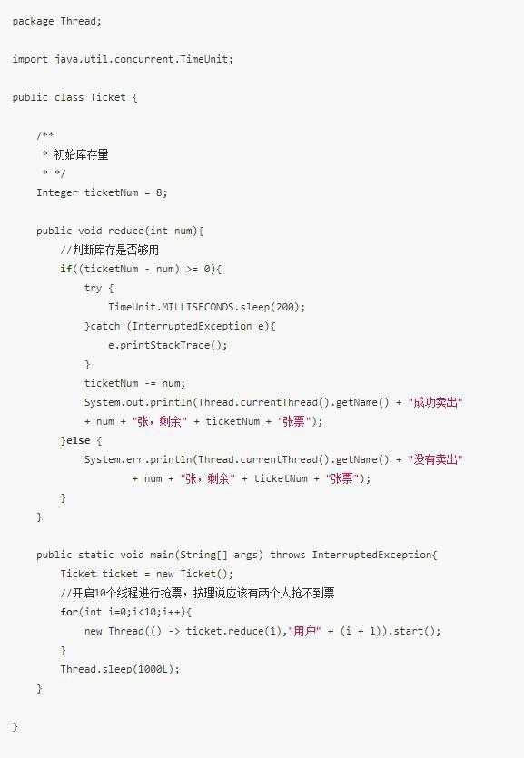 通过一个卖票的小案例来看,比如大家去抢dota2 ti9门票,如果不加锁的话会出现什么问题?此时代码如下: