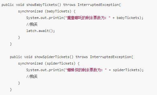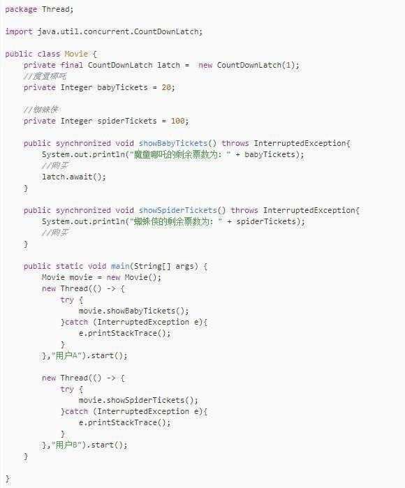 举个例子,有两场电影,分别是最近刚上映的魔童哪吒和蜘蛛侠,我们模拟一个支付购买的过程,让方法等待,加了一个CountDownLatch的await方法,运行结果如下: