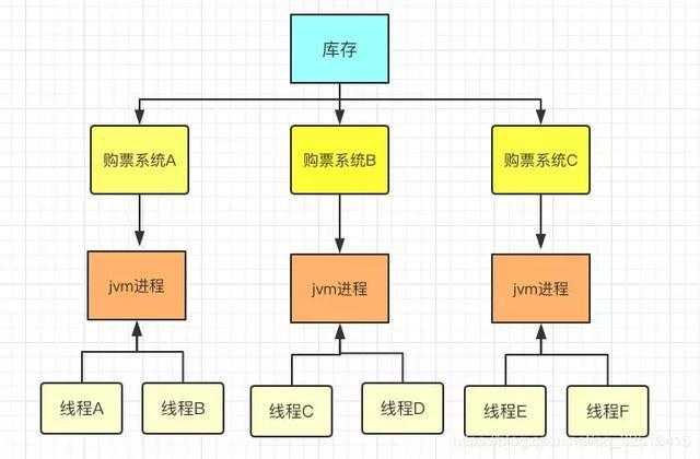 上图所示是我们搭建的分布式环境,有三个购票项目,对应一个库存,每一个系统会有多个线程,和上文一样,对库存的修改操作加上锁,能不能保证这6个线程的线程安全呢?